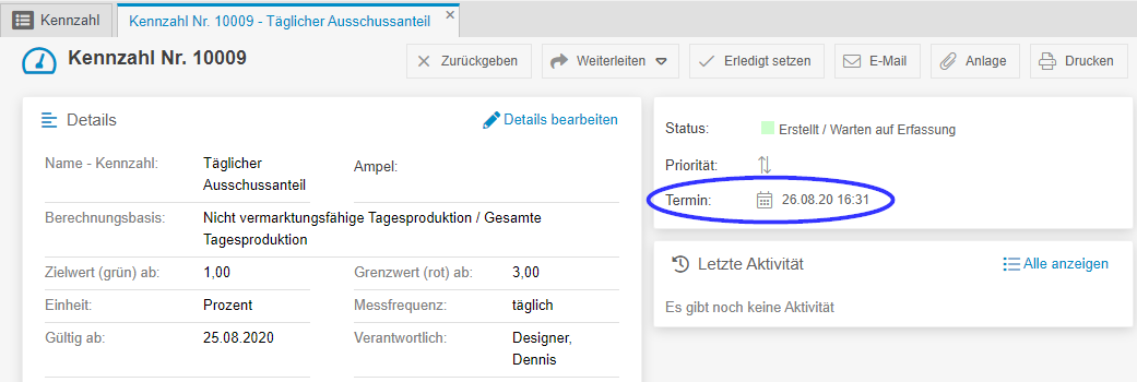 Im Beispiel wird von dem Verantwortlichen also am 26.08.2020 um 16:31 Uhr die Erfassung der Kennzahl angefordert. Direkt nach der Anforderung wird der Termin für die nächste notwendige Erfassung neu berechnet. Da im Beispiel eine tägliche Messfrequenz vorgegeben wurde, wird also am 27.08.2020 um 16:31 Uhr das nächste Mal die Erfassung angefordert.