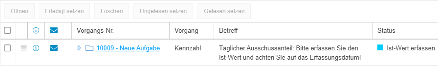 Wird z. B. eine täglich zu erfassende Kennzahl 3 Tage in Folge nicht vom Verantwortlichen eintragen, findet dieser insgesamt 3 offene Aufgaben zur Erfassung der Kennzahl in seiner Liste "Meine Vorgänge" - für jeden Tag eine separate Aufgabe.