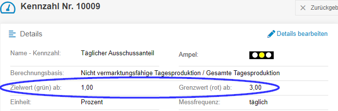 Um den Ist-Wert einer Kennzahl ins Verhältnis setzen zu können, werden bei jeder Erfassung die momentan gültigen Ziel- und Grenzwerte mit gespeichert. Sollten sich im Verlauf der Zeit die intern gesetzten Ziele ändern, können die Werte diese über <Details bearbeiten> im Vorgangsfenster der Kennzahl angepasst werden.