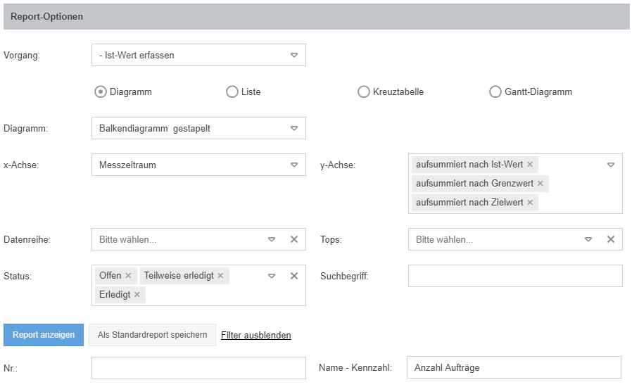 Das folgende Anschauungsbeispiel zeigt die Konfiguration und Ergebnisansicht eines Reports, bei dem die erfassten Werte der Kennzahl "Anzahl Aufträge" mit Ziel- und Grenzwerten dargestellt werden.