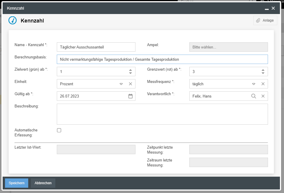 - Messfrequenz -> In Abhängigkeit von der Messfrequenz erhält der ausgewählte Verantwortliche täglich, wöchentlich etc. die Aufgabe zur Erfassung des aktuellen Werts des Tages, der Woche etc.