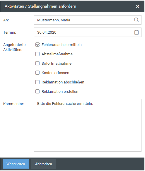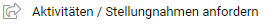 ![]() Über den Button <Aktivitäten / Stellungnahmen anfordern> können Sie eine Aktivität von einer anderen Organisationseinheit beziehungsweise einem anderen Benutzer anfordern. ![]() Nachdem Sie über die Schaltfläche "An" einen Empfänger gewählt haben, bekommen Sie eine Auswahl an Aktivitäten, die vom Empfänger erstellt werden dürfen. Sie können über die Kontrollkästchen im Abschnitt "Angeforderte Aktivitäten" wählen, welche Aktivitäten Sie an den Empfänger weiterleiten beziehungsweise von ihm anfordern möchten. |