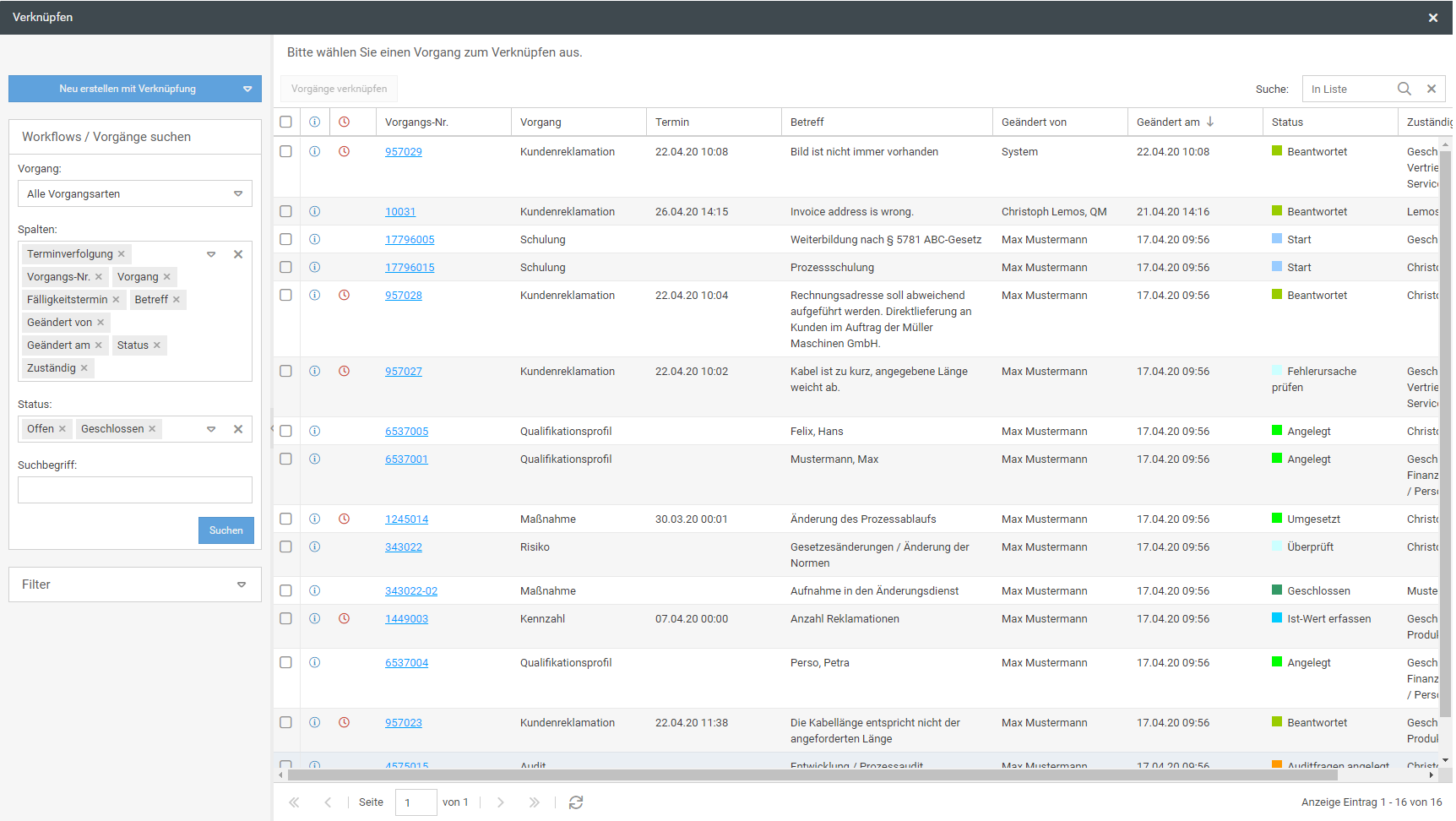 ![]() Über den Button <Verknüpfen / Neu erstellen> können Sie den Vorgang mit bereits bestehenden Vorgängen verknüpfen. Es können ebenfalls neue Vorgänge erstellt werden, zu denen eine Verknüpfung hergestellt wird. ![]() |