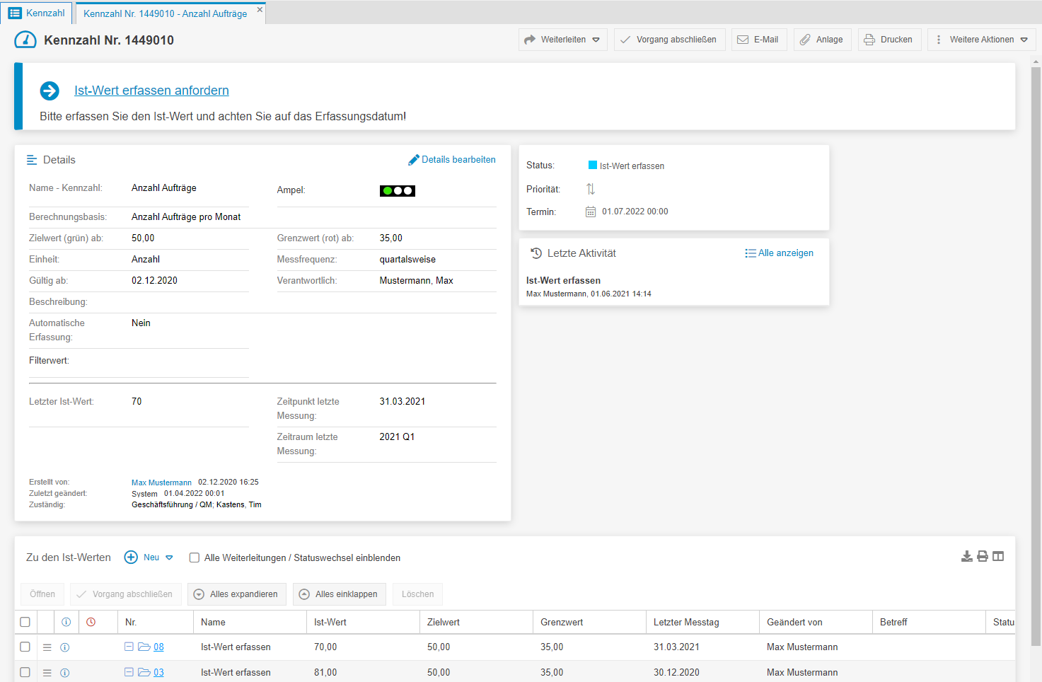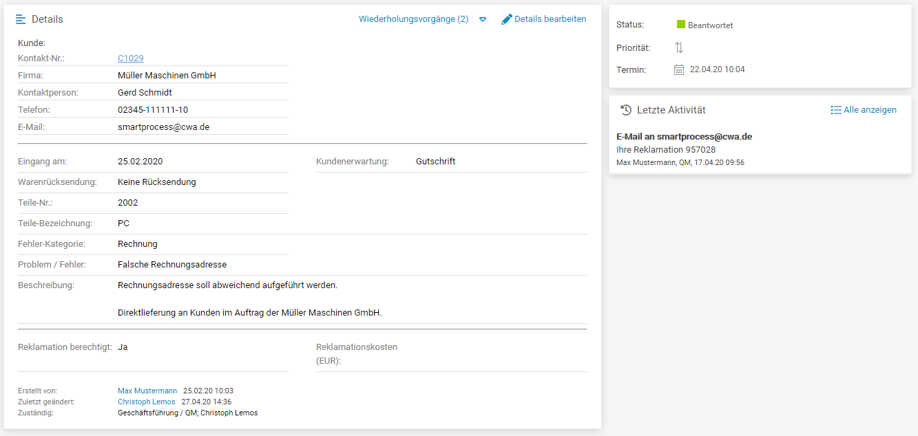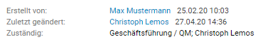 Am Ende des Detail-Fensters wird angezeigt, von wem der Vorgang wann erstellt wurde und wer ihn zuletzt geändert hat. Am wichtigsten ist die Anzeige, wer derzeit für den Vorgang zuständig ist.