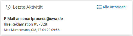 Im Fenster "Letzte Aktivität" wird die letzte durchgeführte Aktivität angezeigt. Die Anzeige dieses Fensters kann im Formulardesigner aktiviert und deaktiviert werden.