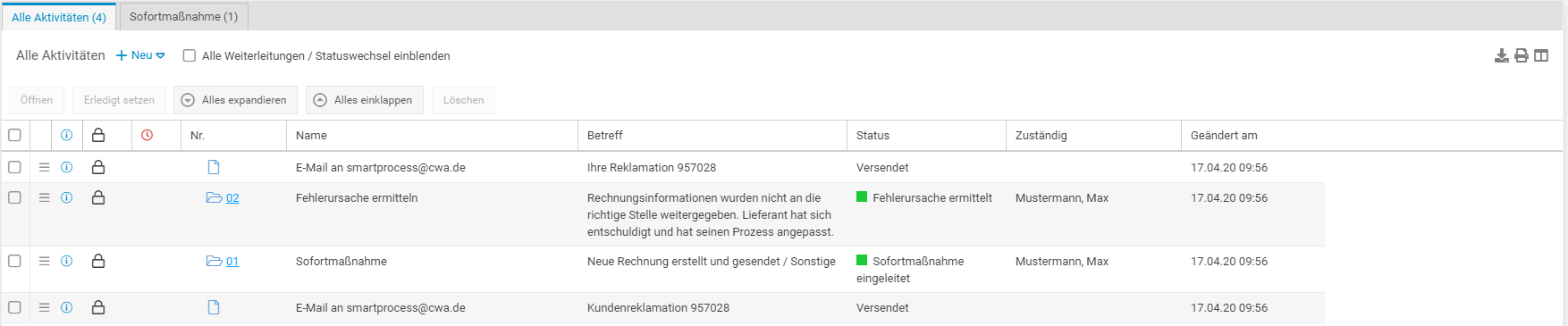 In der Aktivitätenliste werden die durchgeführten Aktivitäten und Sub-Vorgänge aufgelistet.