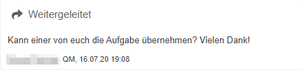 Wenn der Vorgang über den Hauptmenü-Eintrag Weiterleiten an einem anderen Benutzer oder einer Org.-Einheit zugeordnet wurde und ein Kommentar zu der Weiterleitung eingetragen wurde, wird dies in einer eigenen Box angezeigt.