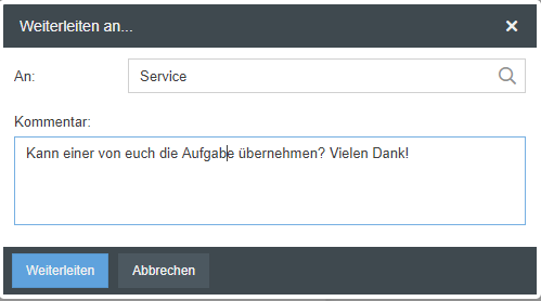 ![]() ![]() ![]() | Über den Button <Weiterleiten an> kann der Vorgang an einen Benutzer oder ein Organigramm-Objekt weitergeleitet werden. Die Weiterleitung kann um einen Kommentar für den Empfänger des Vorgangs ergänzt werden. ![]() In Abhängigkeit des Berechtigungsprofils kann ein Vorgang eventuell nur an Benutzer weitergeleitet werden, die derselben Organisationseinheit zugeordnet sind. Wird der Button als Auswahlliste angezeigt, kann der Vorgang an den letzten Bearbeiter zurückgesendet werden. |