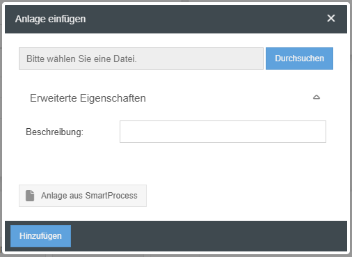 ![]() | Über den Button <Anlage> können Sie an den Vorgang beliebige Dateien anhängen. ![]() Über den Button <Anlage aus SmartProcess> kann eine Dateianlage eines Dokuments aus SmartProcess an den Vorgang angefügt werden. |
