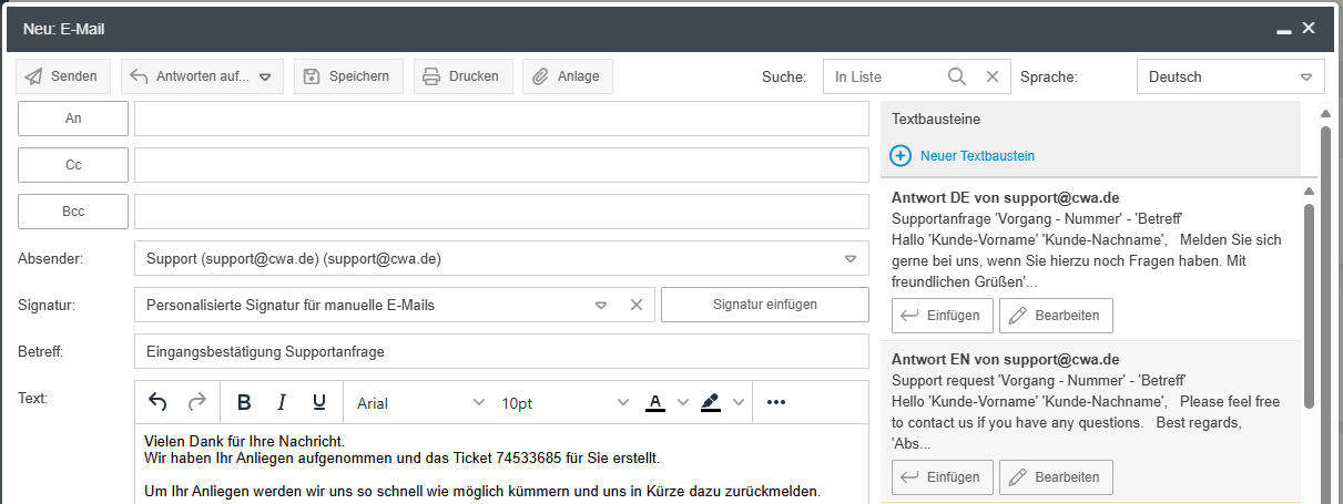 ![]() | Mit dem Button <E-Mail> können E-Mails aus dem Vorgang heraus gesendet werden. Auf der rechten Seite ist ein Zugriff auf vorkonfigurierte Textbausteine, die in den Einstellungen unter Textbausteine - Vorgangs-E-Mails definiert werden können. Außerdem können in der Administration Signaturen definiert werden, die in diesem Fenster im Drop-Down-Feld Signatur ausgewählt und dem E-Mail-Text hinzugefügt werden können. Mit den Buttons <An>, <Cc> und <Bcc> links neben den Empfänger-Feldern wird das Kontaktverzeichnis geöffnet, über das auch die internen Benutzer aufgerufen werden können. Alternativ können auch eine oder mehrere, durch ein Semikolon getrennte E-Mail Adressen manuell eingetragen werden. ![]() Mit einem Klick auf Über den Button <Anlage> können der E-Mail eine oder mehrere Anlagen angefügt werden. Aus dem Vorgang versendete E-Mails werden in der Aktivitätenliste des Vorgangs gespeichert. |