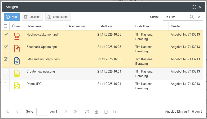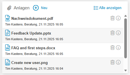 Über den Button <+ Neu> oder generell per Drag and Drop im Vorgangsfenster lassen sich neue Dokumente hinzufügen und über das Papierkorb-Symbol können Anlagen wieder gelöscht werden.