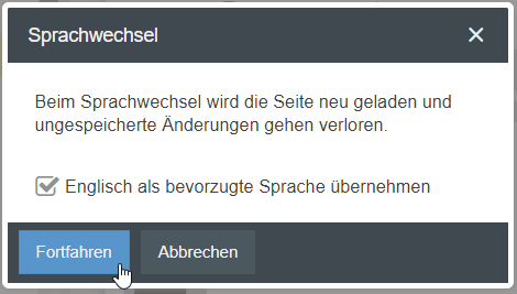 Sprachauswahl ![]() | Diese Auswahl wird nur eingeblendet, wenn mehr als eine Systemsprache für SmartProcess aktiviert wurde und bietet die Möglichkeit zwischen diesen zu wechseln. Beim Wechsel der Sprache kann der Benutzer die ausgewählte Sprache als dauerhafte Präferenz festlegen. Dies sorgt dafür, dass der Benutzer beim nächsten Login direkt in dieser Sprache angemeldet wird und die E-Mails aus SmartProcess in dieser Sprache empfängt. ![]() |