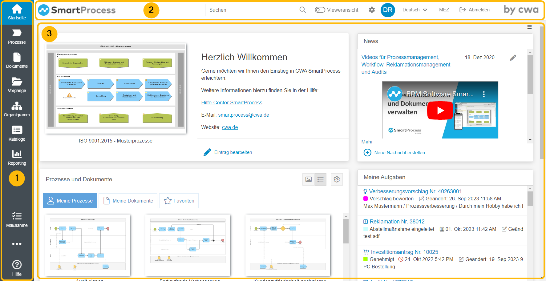 SmartProcess ist in drei Hauptbereiche aufgeteilt. 1 - Hauptmenü. Im Hauptmenü befinden sich Schnellzugriffe auf die wichtigsten Bereiche von SmartProcess (z. B. Prozesse, Vorgänge, Reporting) sowie…