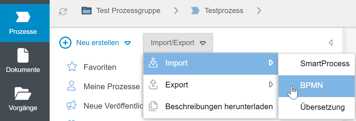 Wenn Sie einen Prozess aus einem anderen Tool als .bpmn-Datei exportiert haben, können Sie zur Übertragung des Prozessmodells in SmartProcess über folgenden Pfad den BPMN-Import starten: Menü Prozesse -> Import/Export -> Import -> BPMN
