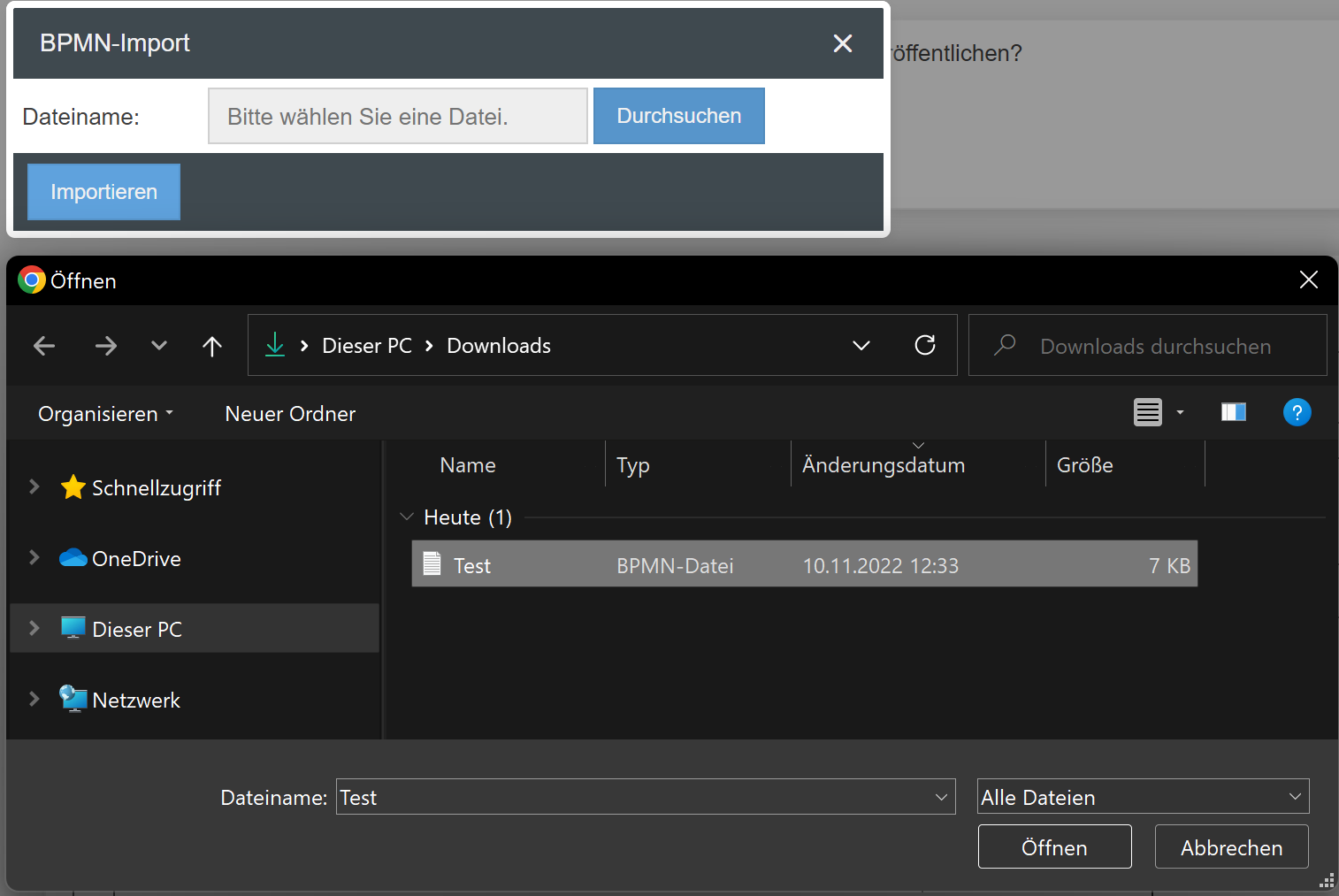 SmartProcess unterstützt den BPMN-Standard. Mit der Export- und Importfunktion von .bpmn-Dateien ist es möglich, Prozessmodelle aus anderen Tools in SmartProcess zu übertragen.