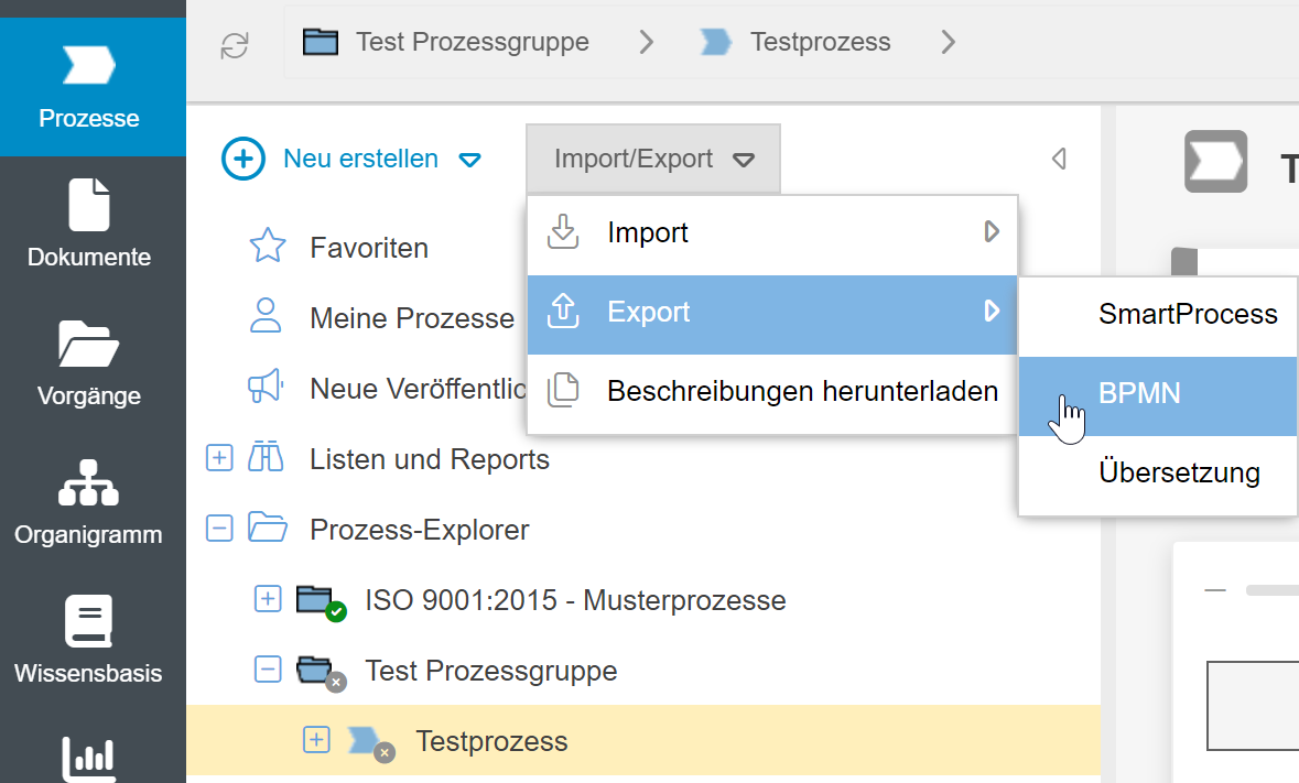 Um ein Prozessmodel aus SmartProcess als .bpmn-Datei zu exportieren, öffnen sie ihn im Prozess-Explorer. Anschließend wählen Sie im Navigationsbereichs den Pfad Import/Export -> Export -> BPMN.