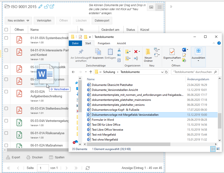 In einem angelegten Ordner kann ein Dokument auch per Drag & Drop erstellt werden. Öffnen Sie dazu einen Ordner auf Ihrem PC und ziehen die gewünschte Datei per Drag & Drop in den Inhaltsbereich des Dokumente-Menüs.