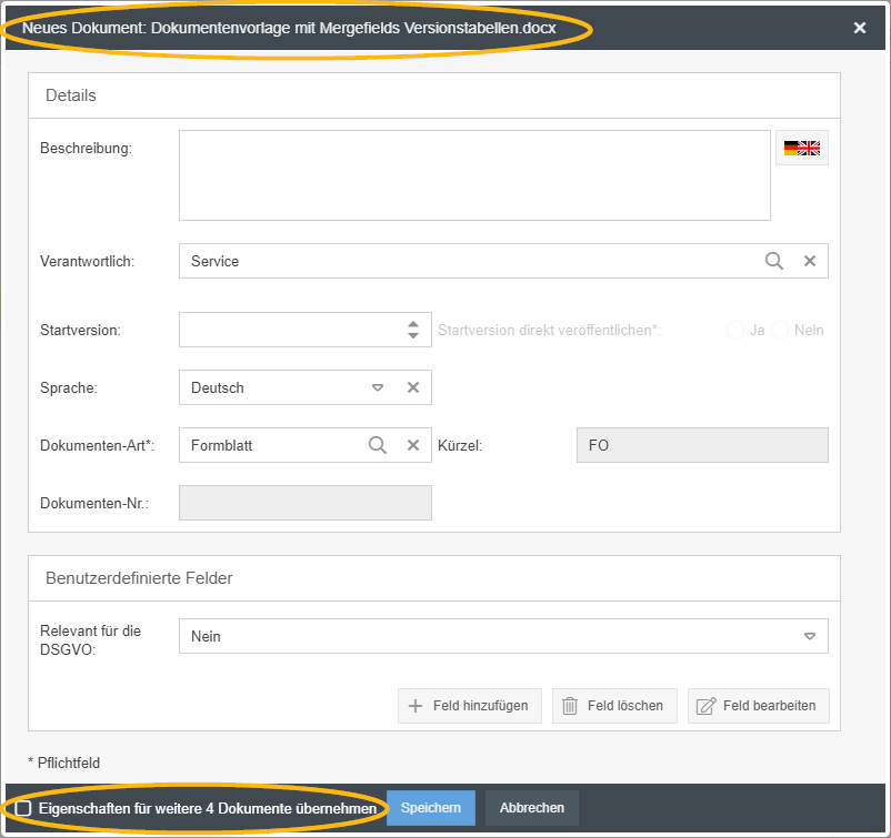 - Im Fußbereich befindet sich die Checkbox "Eigenschaften für weitere X Dokumente übernehmen".