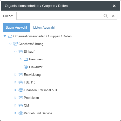 Verantwortlich | In dem Feld Verantwortlich kann die für das Dokument verantwortliche Einheit eingetragen werden. Mit einem Klick auf die Lupe öffnet sich das Organigramm, aus dem eine Org.-Einheit, Rolle oder ein Benutzer ausgewählt werden kann. Dieses Feld kann über die Einstellungen zu einem Pflichtfeld gemacht werden. ![]() Wählen Sie für den Dokumentenverantwortlichen eine Org.-Einheit oder Rolle aus dem Organigramm. Wenn ein Benutzer ausgewählt wird, müssen bei einem Wechsel der Verantwortlichkeit die Details von jedem Dokument bearbeitet werden, bei dem der Benutzer als Verantwortlicher eingetragen war. Dem Dokumentenverantwortlichen kommen einige besondere Funktionen zu (Wird eine Org.-Einheit oder Rolle als Verantwortlich festgelegt, gilt dies für alle Benutzer dieser Org.-Einheit / Rolle)