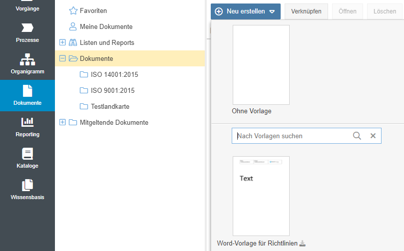 Klicken Sie auf <Neu erstellen> oberhalb des Inhaltsbereichs des Dokumente-Menüs. Hier können Sie ein neues Dokument mit oder ohne Dateivorlage erstellen. Vorlagen können durchsucht werden und es steht eine Vorschau zur Verfügung.