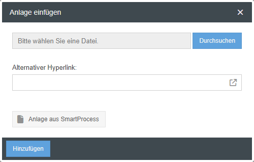 Button <Datei hinzufügen> | Über den Button <Datei hinzufügen> kann dem Dokument eine Dateianlage hinzugefügt werden. Dies kann auch per Drag & Drop direkt aus einem Ordner vom Laufwerk geschehen. Öffnen Sie hierzu einfach einen Ordner ziehen Sie die gewünschte Datei per Drag & Drop in das Erstellungsfenster. Statt einer Dateianlage kann im Feld Alternativer Hyperlink auch eine URL angegeben werden, die zu einem extern gespeicherten Dokument verweist. Ein Dokument muss also nicht zwingend eine Word-, Excel- oder PDF-Datei enthalten. ![]() |