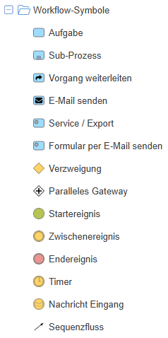 Folgende Workflow-Objekte, die im Prozess-Designer in einem eigenen Ordner zusammengefasst sind, werden für die Konfiguration eines Workflows benötigt: