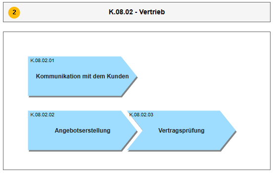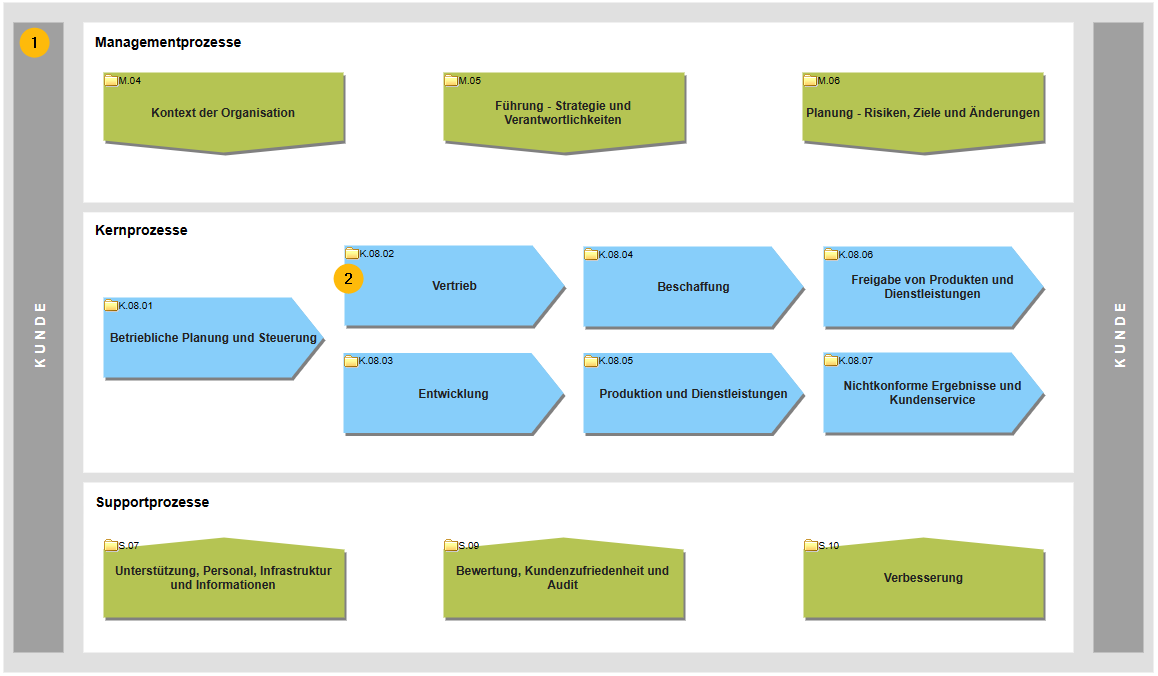 Per Klick auf die modellierten Objekte kann man durch die verschiedenen Ebenen der Prozessgruppen navigieren, sodass sie sich für die Erstellung von ein- oder mehrstufigen Prozesslandkarten bzw. Prozesslandschaften eignen. So können auch mehrere Prozesslandkarten für eine Unternehmensgruppe oder verschiedene Standorte erstellt werden. Mit der entsprechenden Einstellung kann man Usern aus verschiedenen Standorten auf der Startseite unterschiedliche Prozesslandkarten anzeigen.