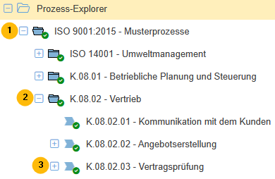 Das Objekt Prozessgruppe (Beispiele Nr. 1 & 2) ist vergleichbar mit Ordnern im Windows-Explorer. Es wird genutzt, um die Prozesse in SmartProcess in Ordnern zu gruppieren. Dabei können Sie Prozessgruppen über mehrere Ebenen untereinander anordnen, um "Unterordner" zu erstellen.