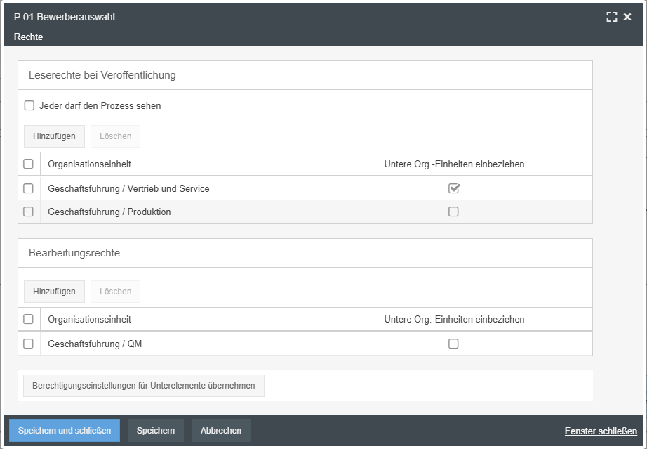 - Auch auf verlinkte Prozesse und Sub-Prozesse anwenden -> Die Rechte werden zusätzlich auch auf wiederverwendete Prozess und Sub-Prozesse entlang der Baumstruktur angewendet