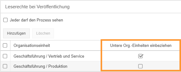 Wenn die im Standard ausgewählte Checkbox <Jeder darf den Prozess sehen> deaktiviert wird, können mit dem Button <Hinzufügen> nacheinander beliebig viele Org.-Einheiten aus dem Organigramm ausgewählt werden. Die Benutzer, die diesen Org.-Einheiten zugeordnet sind, können den Prozess nach der Veröffentlichung sehen.