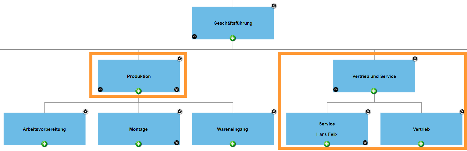 Im oberen Beispiel erhalten die Org.-Einheiten, die "Vertrieb und Service" untergeordnet sind, ebenfalls Leserechte auf den Prozess, während bei der "Produktion" nur direkt der Org.-Einheit zugeordnete Benutzer den Prozess sehen dürfen. In der folgenden Darstellung des Organigramms sind die Org.-Einheiten, die in diesem Fall Leserechte für den Prozess besitzen, umrahmt.