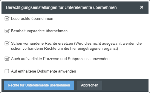 - Auf enthaltene Dokumente anwenden -> Wenn in Prozessmodellen mitgeltende Dokumente verwendet wurden, werden die Berechtigungseinstellungen auch für diese Dokumente übernommen