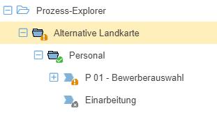 Im folgenden Screenshot können zum Beispiel Rechte für die Prozessgruppe "Alternative Landkarte" eingestellt werden, die dann für die untergeordneten Prozessgruppen / Prozesse "Personal", "P 01 - Bewerberauswahl" und "Einarbeitung" übernommen werden.