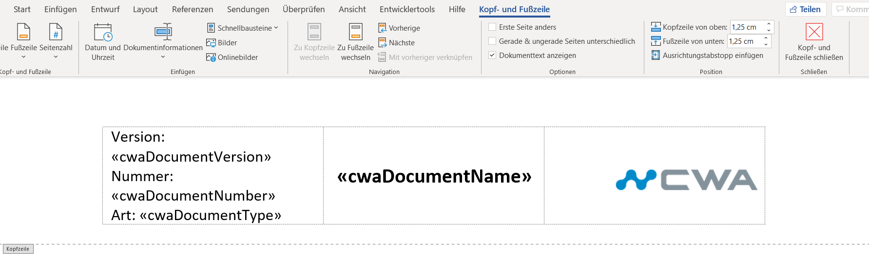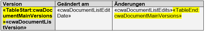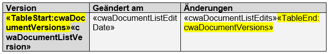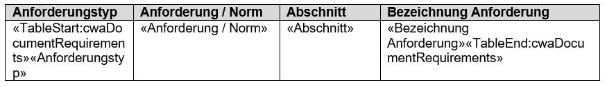- "TableStart:cwaDocumentRequirements" -> Dieses Mergefield wird an den Anfang der ersten Spalte der Tabelle eingefügt