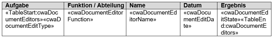 - TableStart:cwaDocumentEditors -> Dieses Mergefield wird an den Anfang der ersten Spalte der Tabelle eingefügt