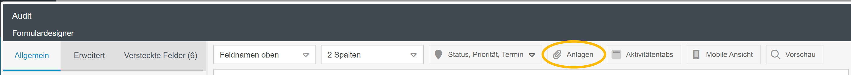 Bei der Gestaltung von Workflow-Formularen können die Dateiformate, die der Endanwender während der Bearbeitung des Vorgangs / der Aufgabe hochladen darf, zusätzlich eingeschränkt werden. Die Einstellung finden Sie im Formulardesigner des Start- oder Aufgabenformulars über den Button <Anlagen>.