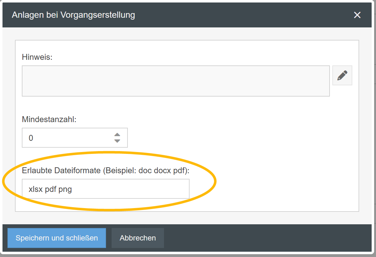 In dem folgenden Fenster können die erlaubten Dateiformate, mit einem Leerzeichen voneinander getrennt, eingetragen werden. Im Beispiel aus dem Screenshot darf der Anwender beim Ausfüllen des Formulars nur Anlagen mit dem Dateiformat .xlsx, .pdf oder .png hochladen.