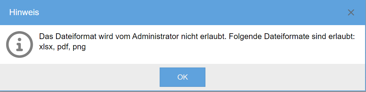 Der Versuch andere Dateiformate zu diesem Formular hinzuzufügen wird unter Anzeige einer Fehlermeldung unterbunden.