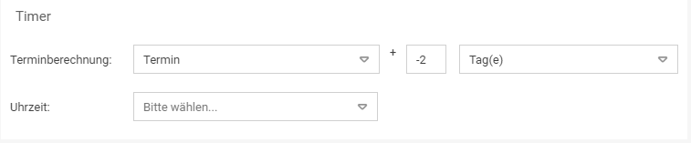 Im Feld "Terminberechnung" kann ausgewählt werden, ab welchen Zeitpunkt oder auf Grundlage welchen Datums die Fristberechnung stattfinden soll. Über das Zahlenfeld und die Auswahlliste kann ein Zeitraum festgelegt werden.