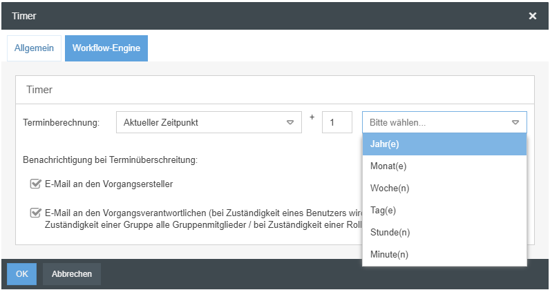 Ein Timer kann nicht nur dafür verwendet werde, um Fristen zu berechnen. Der Timer kann bei Erreichung der Frist auch eskalieren und den Workflow automatisch zu einem bestimmten Status steuern oder z.B. eine benutzerdefinierte Eskalations-E-Mail senden. Abweichend von der automatisch versendeten Eskalations-E-Mail.