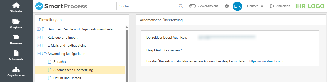 Um technische Unterstützung bei der Übersetzung mehrsprachiger Inhalte zu erhalten, kann die SmartProcess-Anbindung an den Übersetzungsdienst DeepL genutzt werden.