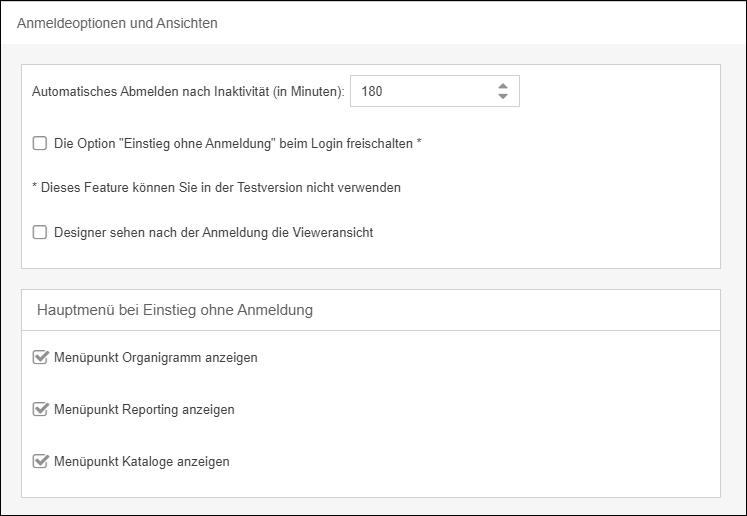Unter "Hauptmenü" können Sie bestimmen, ob die Menüpunkte Organigramm, Reporting und Kataloge für Viewer ohne Anmeldung verfügbar sind.