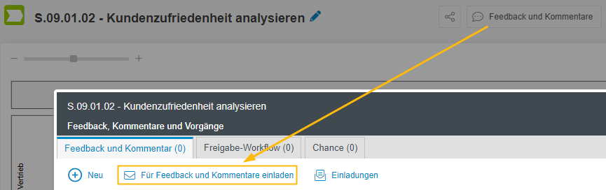 Der Zugang zum Starten eines Feedback-Workflows befindet sich oberhalb des Prozessmodells im Menü <Feedback und Kommentare>