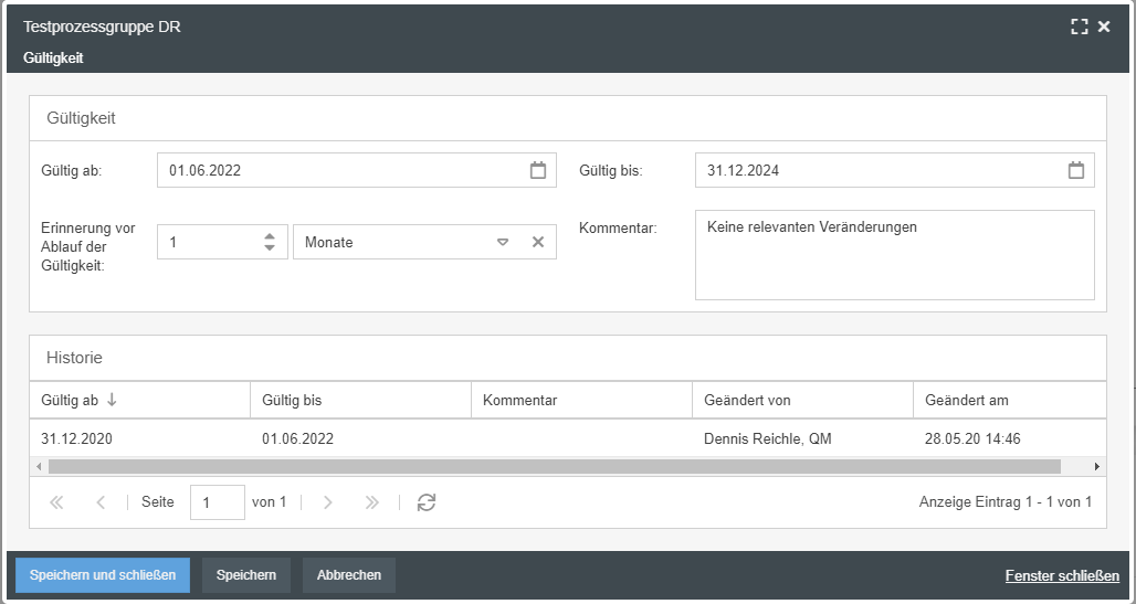 Im oberen Bereich des Fensters kann bei veröffentlichten Prozessen ein neuer Gültigkeitszeitraum eingetragen werden. Bei Änderung der Felder "Gültig ab" und "Gültig bis" erscheint ein verpflichtendes Kommentarfeld. Wird lediglich die Erinnerungsfunktion bearbeitet ist kein Kommentar erforderlich. Über <Speichern und Schließen> ist die Gültigkeit bis zum angegeben Datum verlängert und der Eintrag wird in der Historie vermerkt.