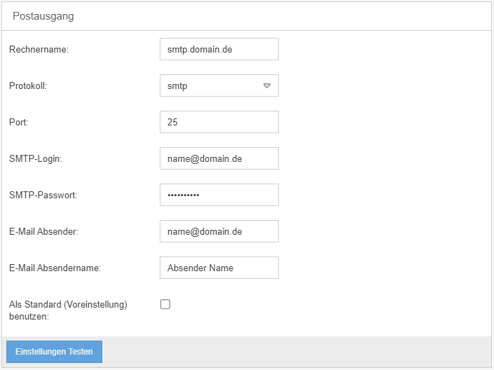 - E-Mail Absender -> Die E-Mail Adresse, die in den ausgehenden E-Mails als Absender verwendet werden soll.