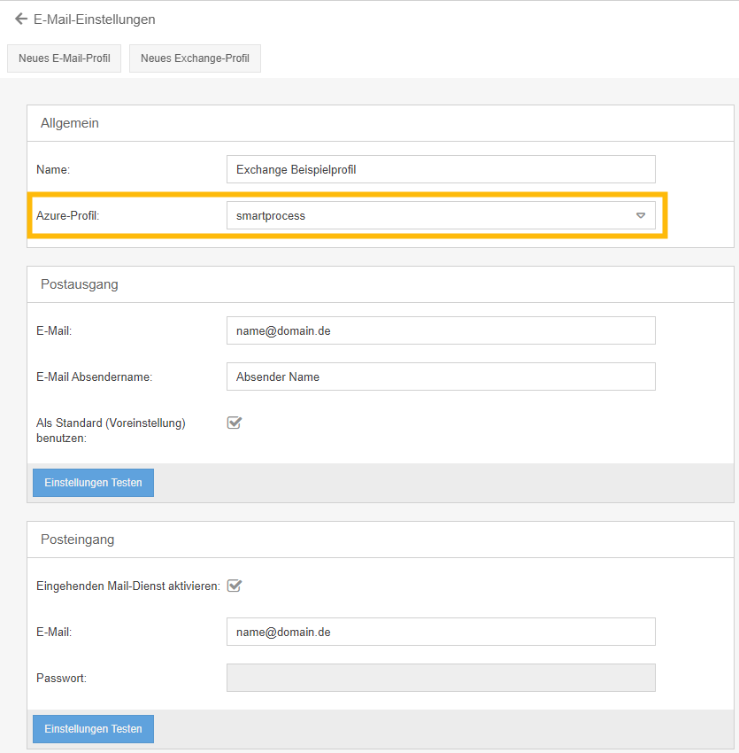 Statt eines E-Mail Profils mit Authentifizierung per smtp, pop3 oder imap können auch Profile für ein Exchange-Konto in SmartProcess hinterlegt werden.