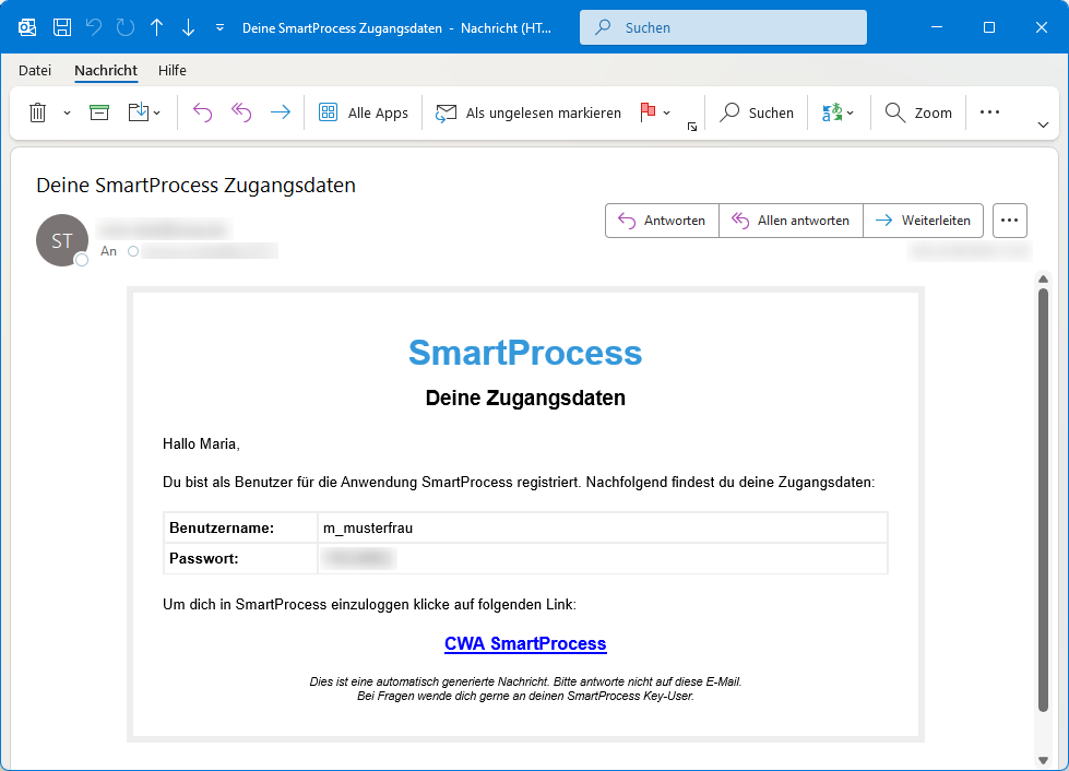 Rufen Sie die Anwendung über den Link in der E-Mail auf (im Beispiel <CWA SmartProcess>)