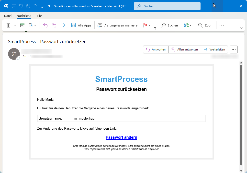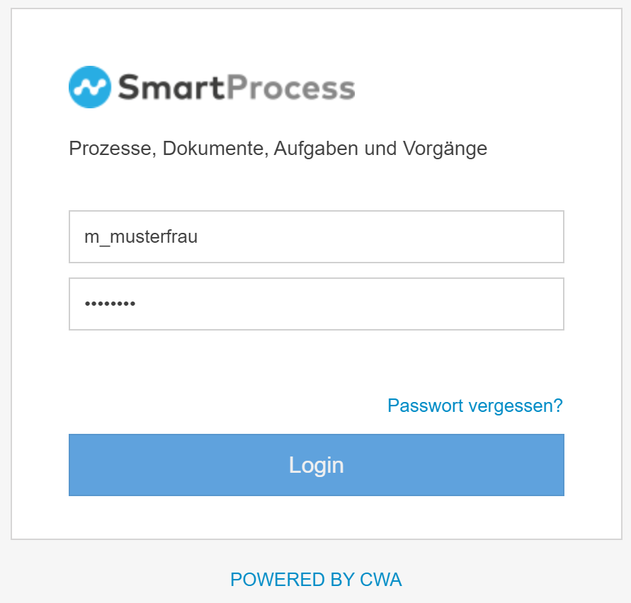 Sie erhalten Ihre Zugangsdaten per E-Mail. Wenn SmartProcess an ein Active Directory angebunden ist, erhalten Sie keine Zugangsdaten per E-Mail. Ihre Zugangsdaten entsprechen dann dem Benutzernamen u…