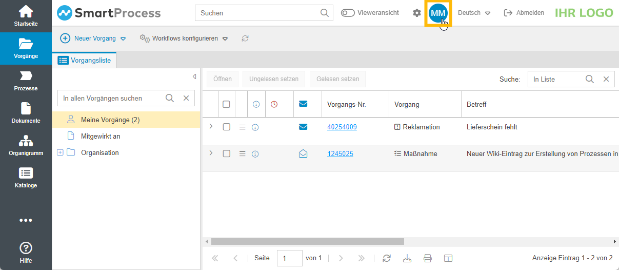 Um Ihr Passwort zu ändern, müssen Sie bereits in SmartProcess angemeldet sein. Klicken Sie auf das Symbol mit Ihren Initialen bzw. das Benutzerbild in der Kopfleiste.