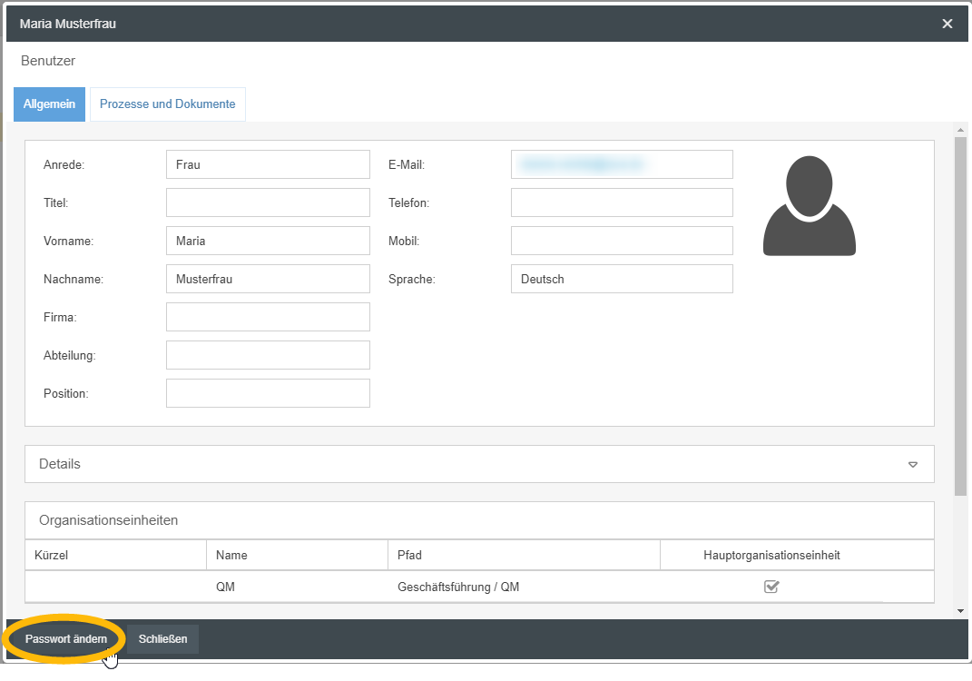 Sie werden zu einer schreibgeschützten Ansicht Ihres Benutzerprofils geleitet. Dort können Sie Ihr Passwort über den Button <Passwort ändern> anpassen. Sie benötigen hierfür Ihr altes Passwort und müssen Ihr neues Passwort entsprechend der festgelegten Passwortregeln vergeben, falls der Administrator des Systems solche Regeln vorgibt.